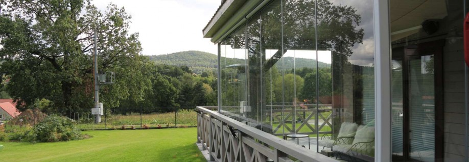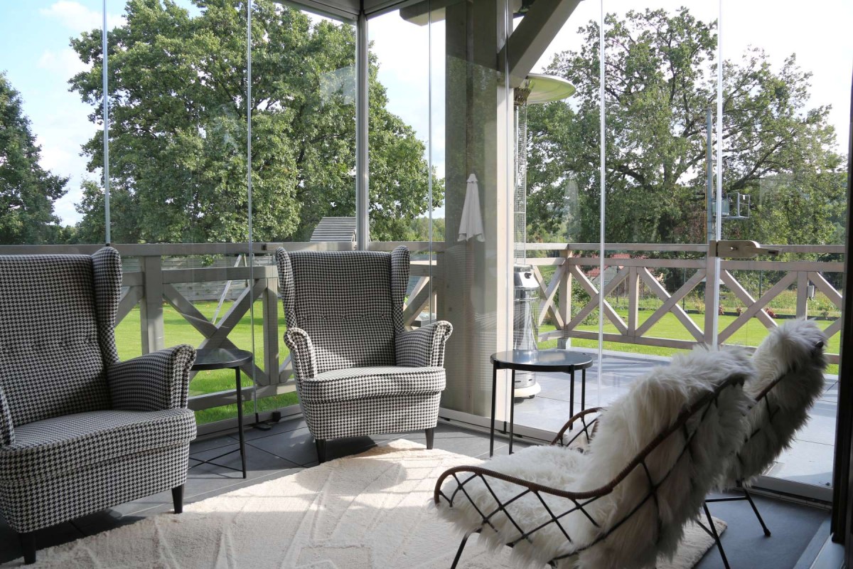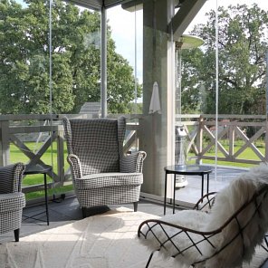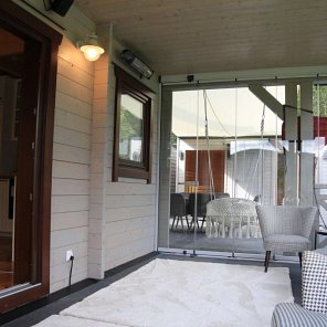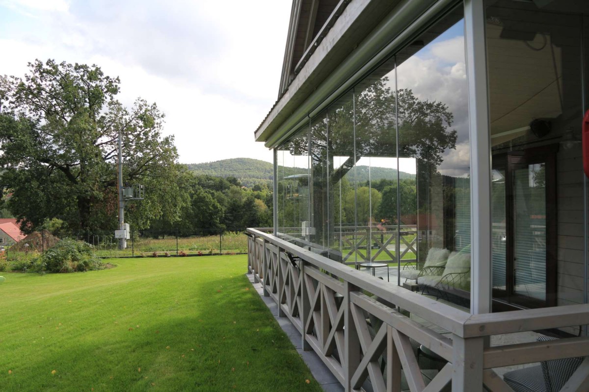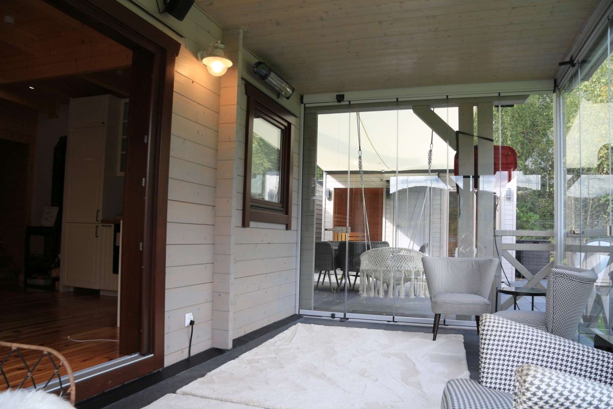 Salon połączony jest z przeszklonym tarasem, tworzącym niezależne pomieszczenie dla wypoczynku.
