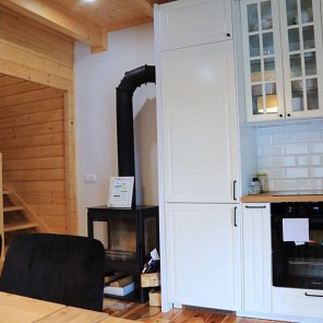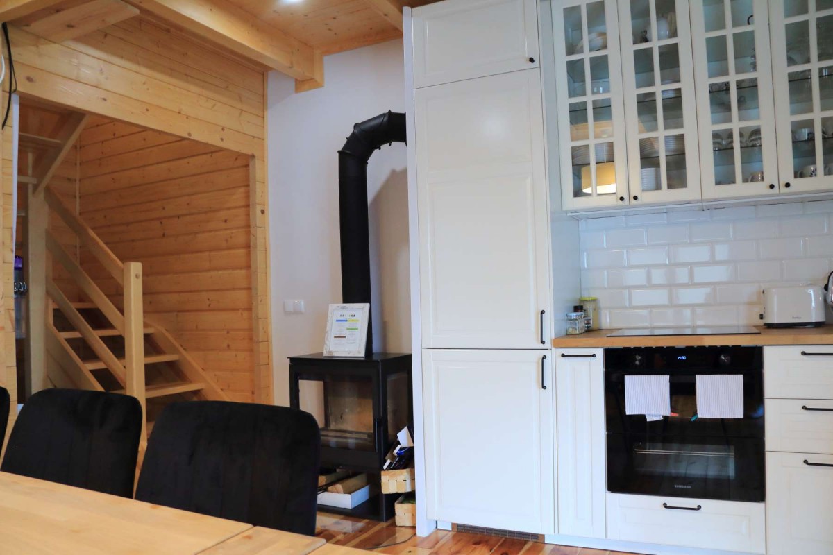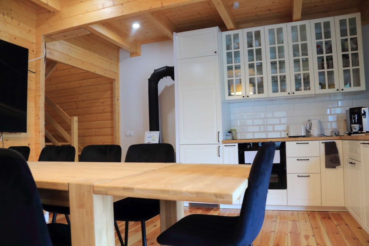 W kuchni zamontowany stylowy kominek typu koza, który uzupełnia niesamowity klimat domu. Strefa jadalni