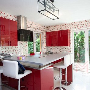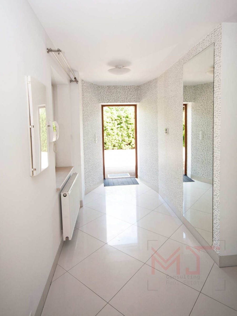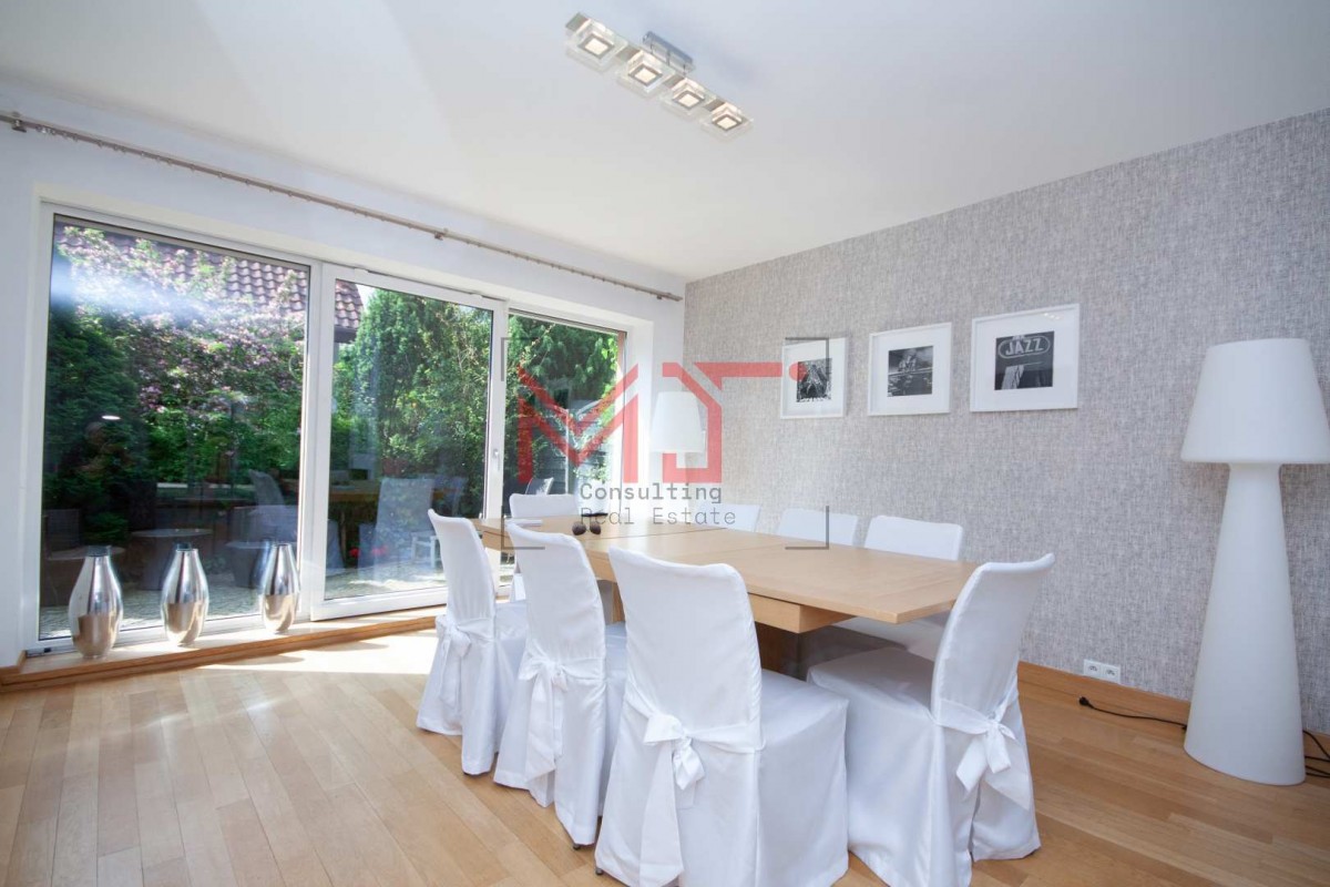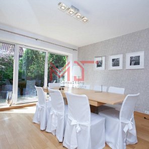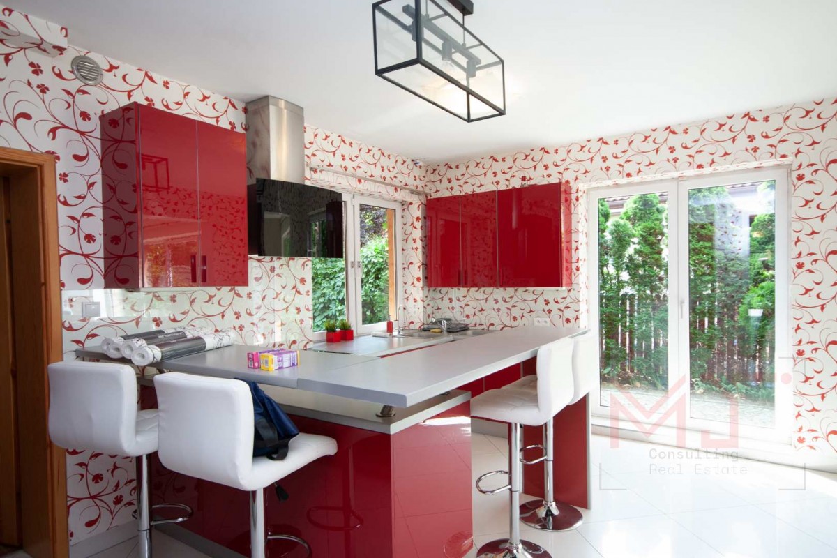 Dom urządzono w nowoczesnym stylu, przy zachowaniu aranżacji i materiałów wysokiej jakości.