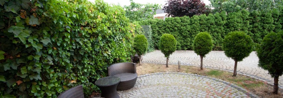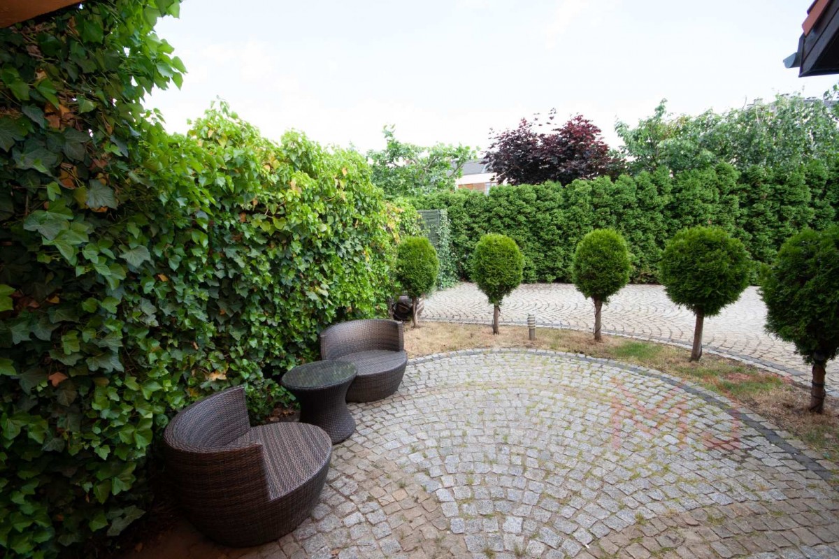Wokół domu urządzono ogródek, wyposażony jest w system nawadniania.