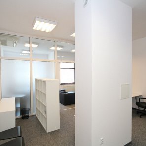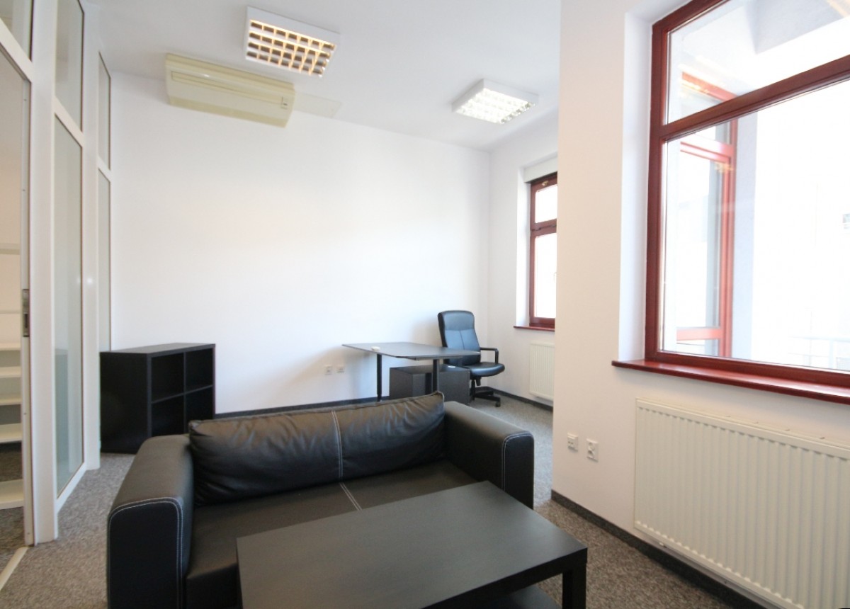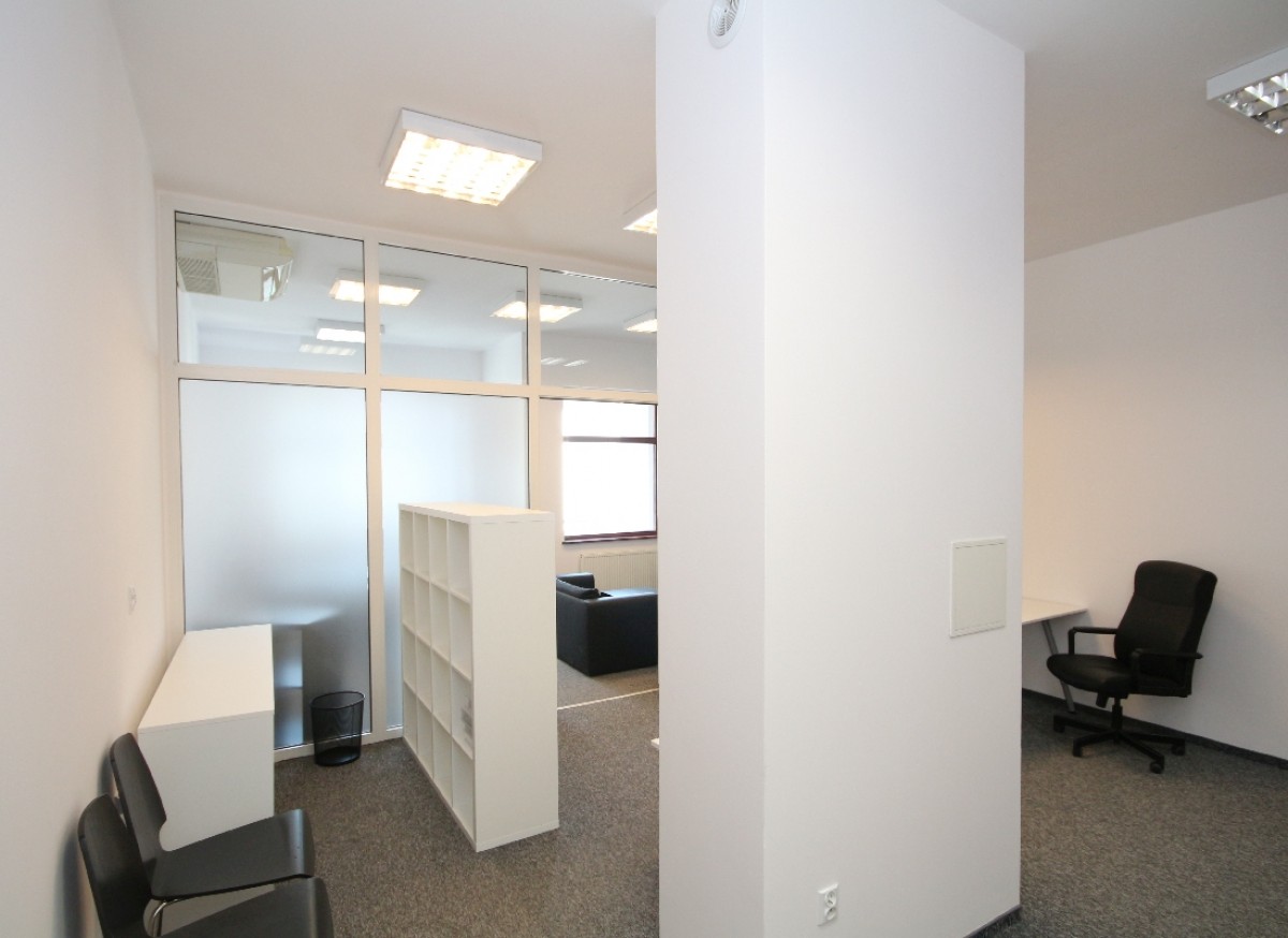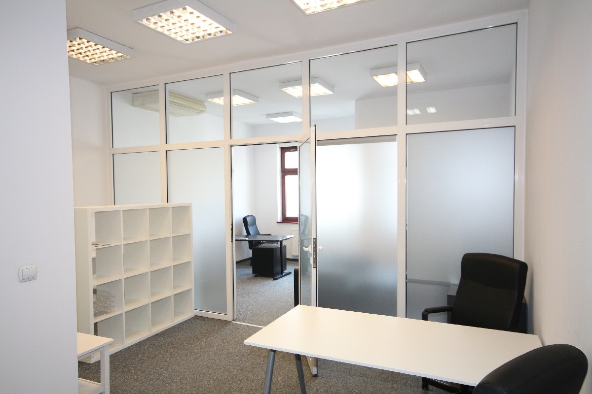 Przestronny i doskonale doświetlony lokal biurowy, składa się z dwóch pomieszczeń oddzielonych szklaną przegrodą.